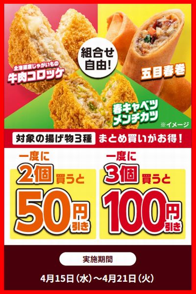 - 【4/15-21】 対象の揚げ物3種まとめ買いがお得!